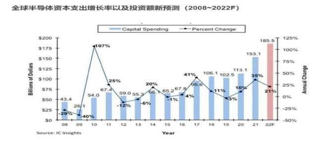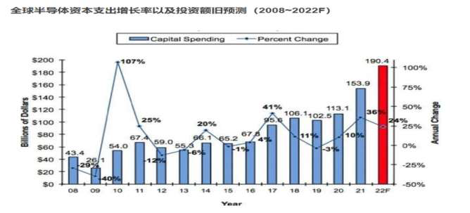 年初,IC Insights 预测2022 年全球半导体资本支出为1904 亿美元,同比增长24%;调整后的新预测为