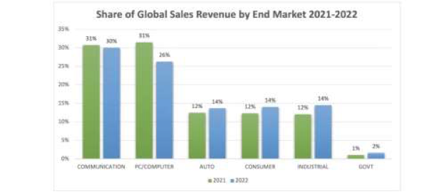 2021-2022 年全球各应用市场的半导体销售额占比