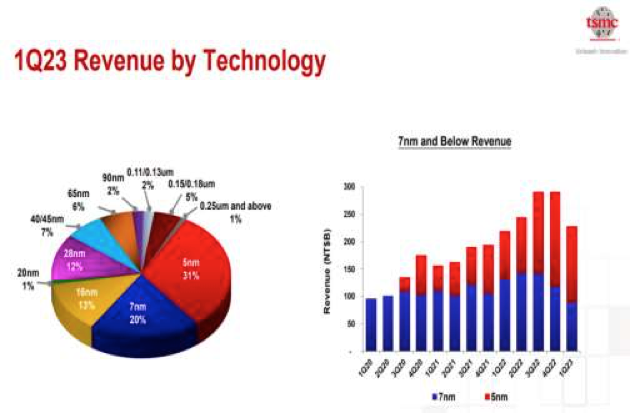 28 纳米 12%(28 纳米以下制程共占 77%,较 2022 年第四季持平),先进制程 7 纳米以下营收达全季晶圆销售
