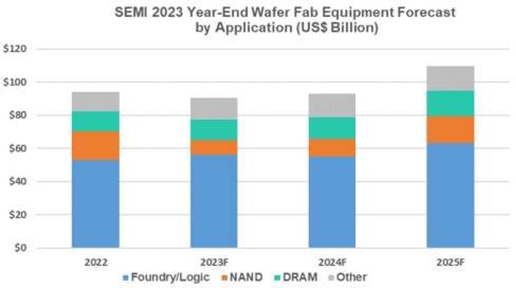 Foundry和logic应用的设备销售额占晶圆厂设备总收入的一半以上,尽管终端市场疲软,但预计2023年将同