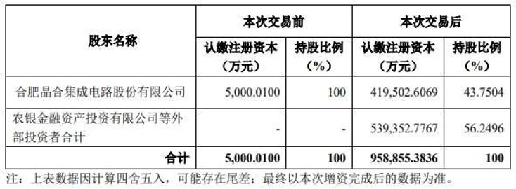其中,晶合集成拟出资41.5亿元认缴注册资本41.45亿元,农银投资等外部投资者拟合计出资54亿元认缴