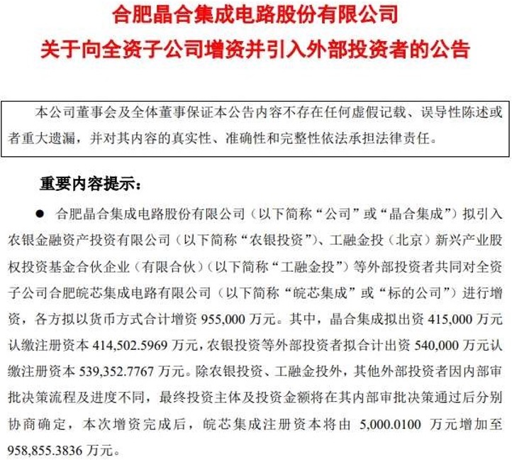 司合肥皖芯集成电路有限公司(以下简称“皖芯集成”)进行增资,各方拟以货币方式合计增95.5亿元。