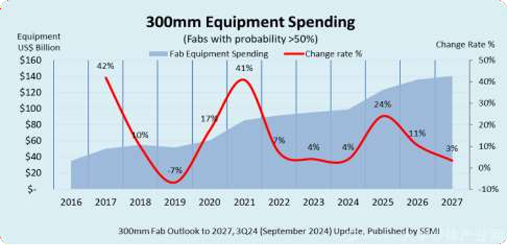 2024年,全球300mm晶圆厂设备支出预计将增长4%,达到993亿美元,到2025年将进一步增长24%,首次