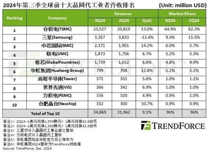 据市场调研机构TrendForce最新数据显示,2024年第三季度全球晶圆代工市场前10出炉(文章末尾有前10