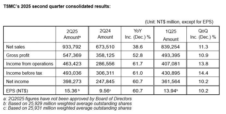 台积电资深副总经理兼首席财务官黄文德表示: “我们第二季度的业务得益于持续强劲的人工智能 和高性能计算相关需求。展望 2025 年第三季度,我们预计我们尖端工艺技术的强劲需求将支撑我们的 业务。”